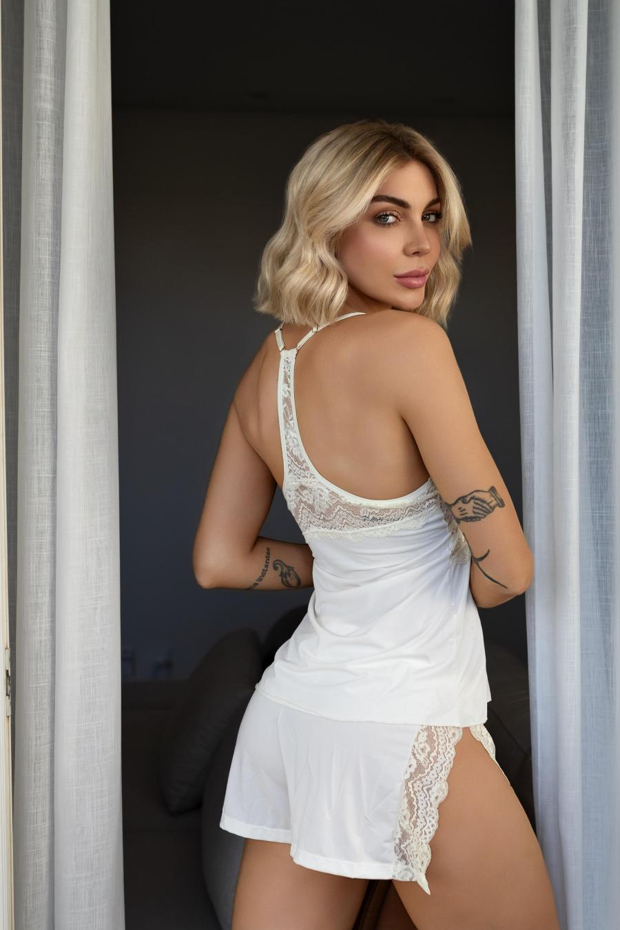 Delicate baby doll with racerback, offering comfort and freedom of movement. The bust is decorated with sophisticated lace, while the shorts feature lace side slits, adding sensuality and charm to the piece. A perfect choice for special moments with comfort and elegance.